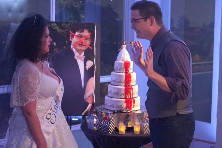 On You’re the Worst Season 4 Episode 8 “A Bunch of Hornballs,” Gretchen throws Lindsey a divorce party while Jimmy travels to promote his book at an erotica convention.