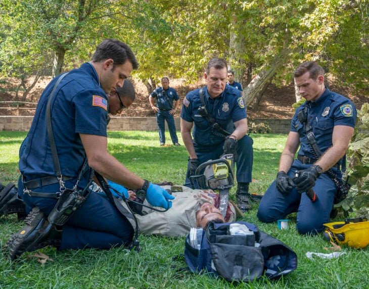 Episode description: The members of the 118 face an awkward rescue call when they arrive on the scene of a man who has over-exerted himself exercising. The team must also save the life of a groundskeeper whose chainsaw cut into him and race to an explosion at a retirement community. Meanwhile, Athena has an extreme reaction to Harry’s new behavior. Then, Hen and Eddie, as well as Buck and Ravi, have rocky starts to their new partnerships, and May receives an emergency call from a suicidal teen while continuing her uneasy work relationship with Claudette.