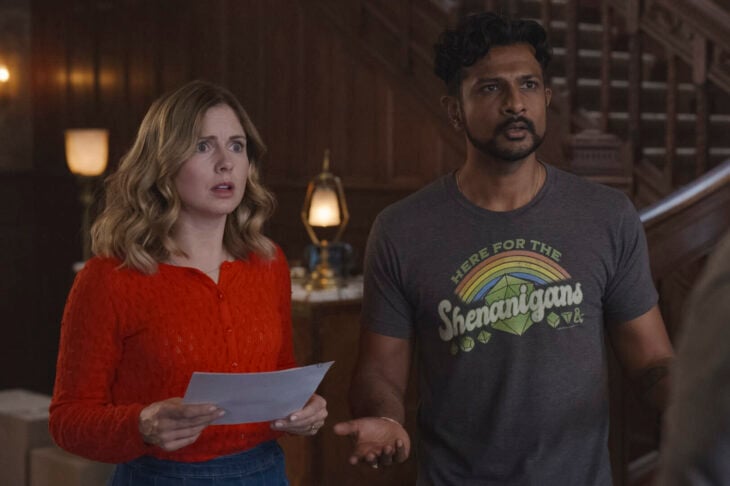 “Jay’s Friends” – GHOSTS. Pictured (L-R): Rose McIver as Samantha and Utkarsh Ambudkar as Jay. Photo: CBS ©2022 CBS Broadcasting, Inc. All Rights Reserved.