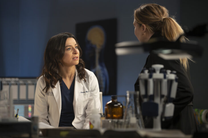 Meredith and Amelia in the lab discussing research on Grey’s Anatomy Season 20 Episode 3, “Walk the Ocean”(Disney/Anne Marie Fox) CATERINA SCORSONE, ELLEN POMPEO